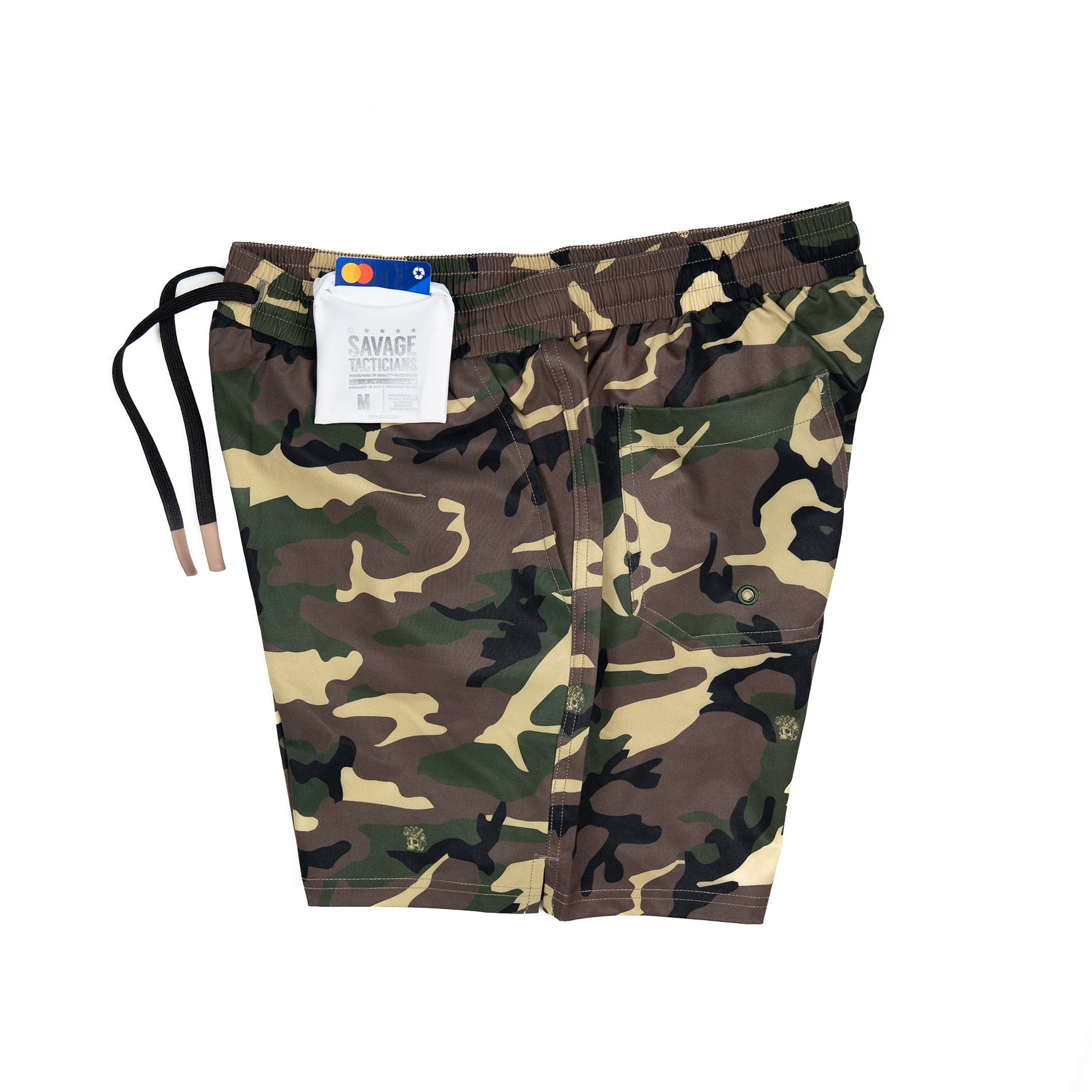 Woodland camo swim trunks are made to conquer surf, sand, and whatever you wreck next. Built for pool hangs, range runs, and every blazing-hot mission in between, these boardshorts deliver relentless comfort. Crafted from a lightweight, quick-dry polyester-spandex blend, they feature a comfy fit, 5.5-inch inseam, compression liner, mesh-lined quick-drain pockets, two front and two back pockets, a in-the-waistband pocket perfect for your ID and credit card.
